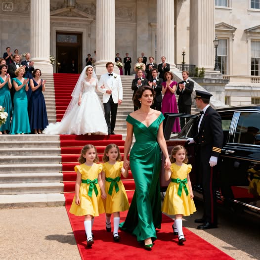 El coche negro se detuvo. El chófer bajó y abrió la puerta con una destreza curtida. Primero aparecieron tres niñas pequeñas, con vestidos amarillos a juego, tomadas de la mano, sus rizos saltando sobre la alfombra roja. Detrás de ellas salió Emma, vestida con un elegante traje verde esmeralda. Su presencia era a la vez segura y serena, su belleza resplandeciente, su fuerza innegable.