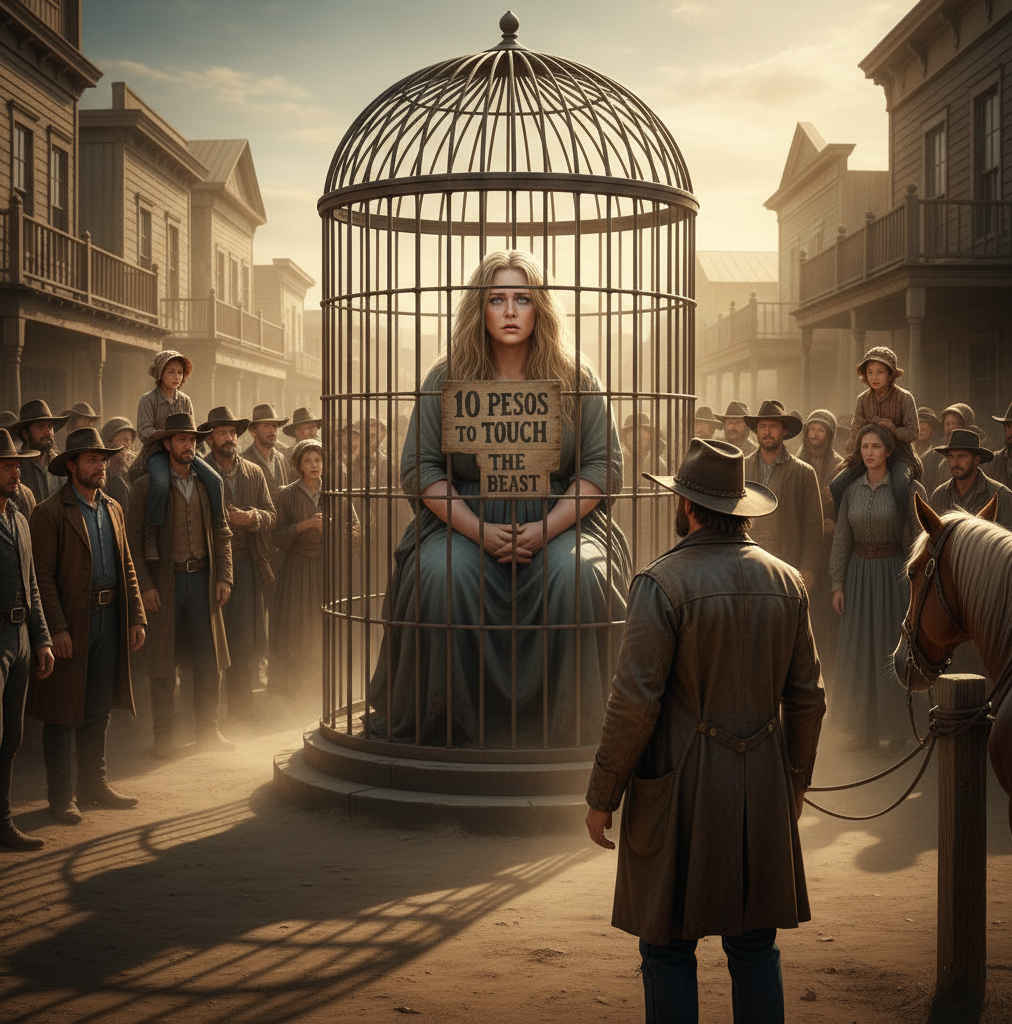 Todos temían a la viuda gigante en la jaula hasta que el vaquero la compró y preguntó, “¿Quieres casarte conmigo? ¿Qué tipo de mujer aterroriza tanto a toda una ciudad fronteriza? La enjaulan como a un animal salvaje. ¿Y qué clase de hombre la ve y piensa en esposa? El letrero decía 10 pesos para tocar a la bestia.